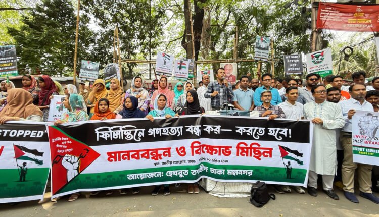 ফিলিস্তিনের গাজায় গণহত্যার প্রতিবাদে মানববন্ধন ও বিক্ষোভ মিছিল করেছে অরাজনৈতিক আন্দোলন হেযবুত তওহীদ। ‘ফিলিস্তিনে গণহত্যা বন্ধ করো, করতে হবে’ -এই স্লোগানে আজ বৃহস্পতিবার (১০ এপ্রিল) সকাল ১০ টায় জাতীয় প্রেসক্লাবের সামনে এই মানববন্ধন ও বিক্ষোভ মিছিল করা হয়।