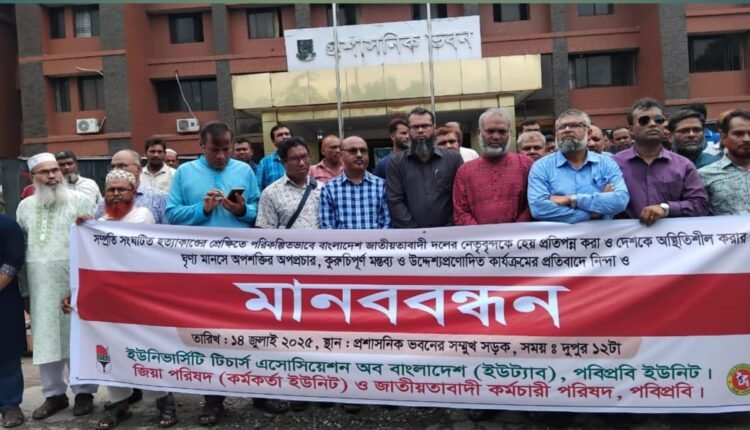 সাম্প্রতিক হত্যা, চাঁদাবাজি, ছিনতাইয়ের পরিপ্রেক্ষিতে আইনশৃঙ্খলার অবনতি হওয়ায় পরিকল্পিতভাবে বাংলাদেশ জাতীয়তাবাদী দল ও দলের নেতৃবৃন্দকে হেয় প্রতিপন্ন করে অপপ্রচার, কুরুচিপূর্ণ মন্তব্য ও উদ্দেশ্যপ্রণোদিত কার্যক্রমের প্রতিবাদে ইউনির্ভাসিটি টিচার্স এসোসিয়েশন অব বাংলাদেশ (ইউট্যাব) পবিপ্রবি ইউনিট, জিয়া পরিষদ (কর্মকর্তা ইউনিট) ও জাতীয়তাবাদী কর্মচারী পরিষদ পবিপ্রবির উদ্যোগে মানববন্ধন কর্মসূচি পালিত হয়।