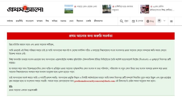 তাই আপনাদের সতর্ক করতে আমি এ বার্তাটি প্রকাশ করছি। আপনাদের প্রযুক্তি বিভাগ ও নির্বাহী কর্মকর্তাদের সামনে আমি সকল নিরাপত্তা ত্রুটি সম্পর্কে বিস্তারিত তুলে ধরতে ইচ্ছুক এবং যুক্ত প্রচেষ্ঠায় দ্রুত সময়ের মধ্যে তা সংশোধন করতে আগ্রহী। আমার সাথে যোগাযোগের জন্য prothomalosecurityconcern [at the rate] duck.com এই ঠিকানায় ই-মেইল করার অনুরোধ করা হলো।