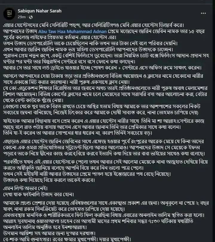 শুধু তাই নয়, আদনানের পরিচালিত প্রতিষ্ঠানগুলোর বিরুদ্ধেও গুরুতর অভিযোগ আনেন সারাহ। তিনি বলেন, বিভিন্ন কোর্সের আড়ালে সেখানে নারী-পুরুষের অবাধ মেলামেশার সুযোগ করে দেওয়া হয়, যা তাকে মানসিকভাবে বিপর্যস্ত করে তুলেছে এবং একারণে তিনি তার অনলাইন ক্লাস পর্যন্ত স্থগিত করতে বাধ্য হয়েছেন। এই পোস্ট সামাজিক মাধ্যমে ছড়িয়ে পড়ার সাথে সাথেই শুরু হয় তীব্র আলোচনা। কিন্তু ঝড়ের কেন্দ্রবিন্দুতে থাকা পোস্টটি হঠাৎই উধাও হয়ে যায় সারাহর প্রোফাইল থেকে।